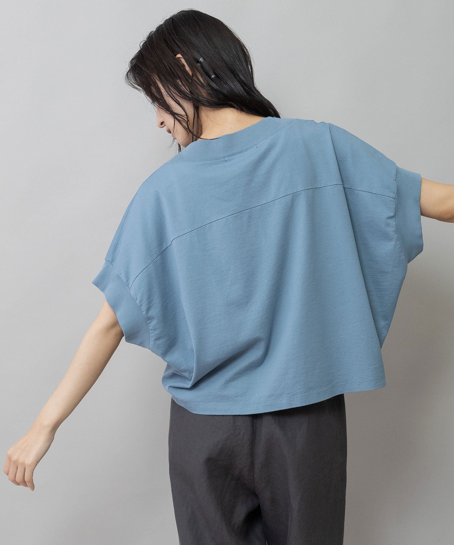 ゆとりのあるドルマンスリーブと太めの衿・袖口を組み合わせ、シンプルな中にも表情のあるデザインに。