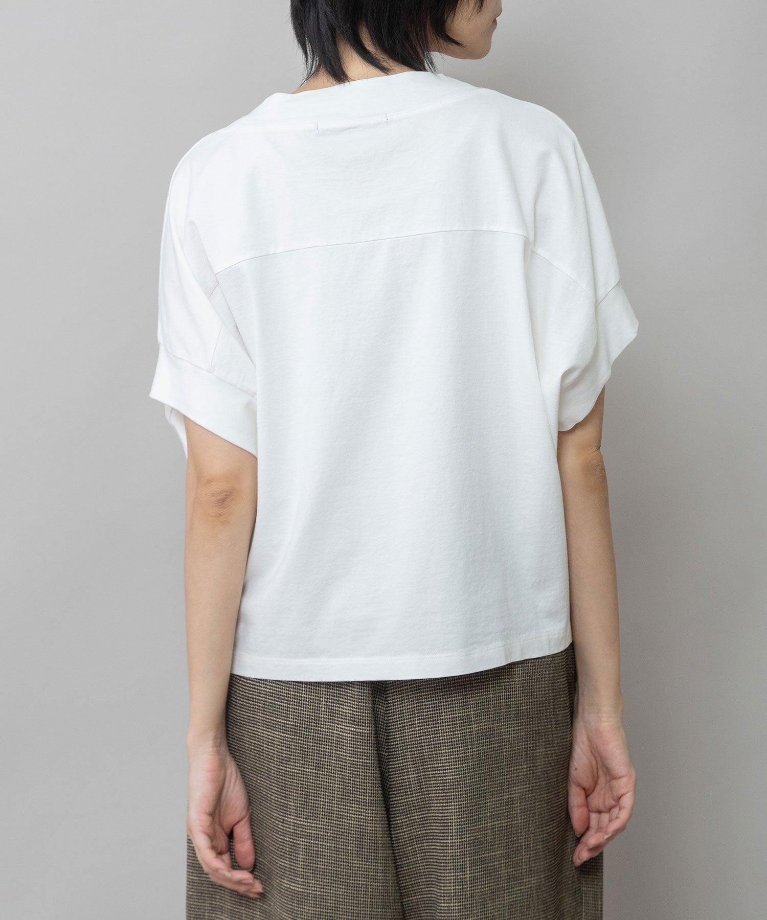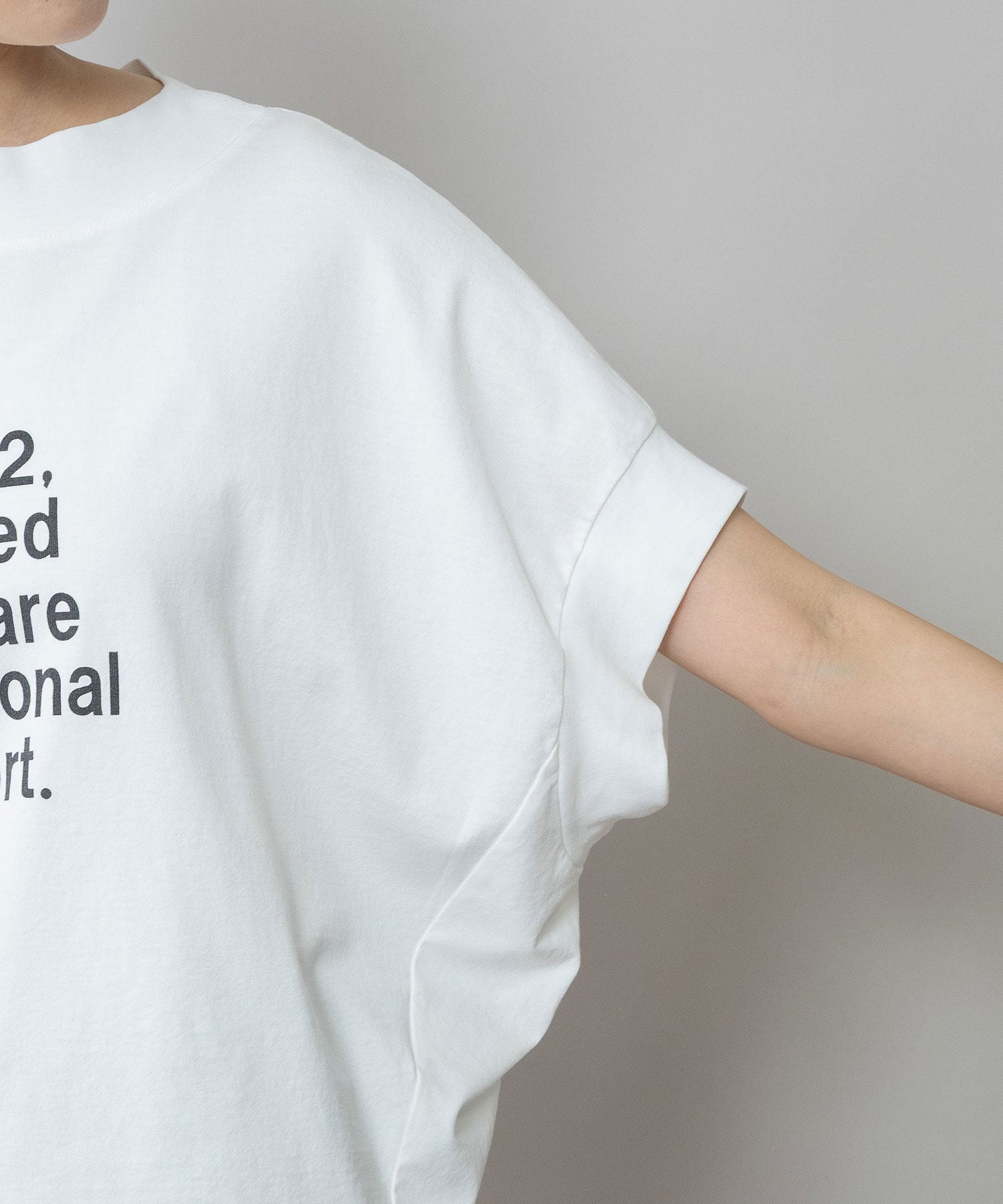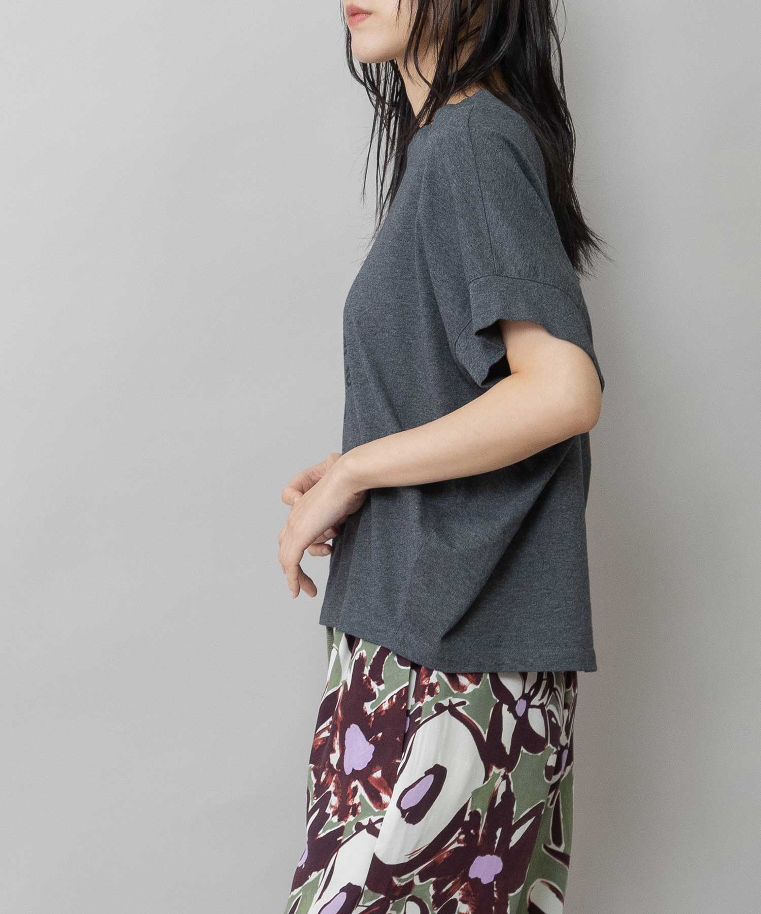 脇の切り替えを前に寄せ、立体的なシルエットに仕上げたデザインTシャツ。