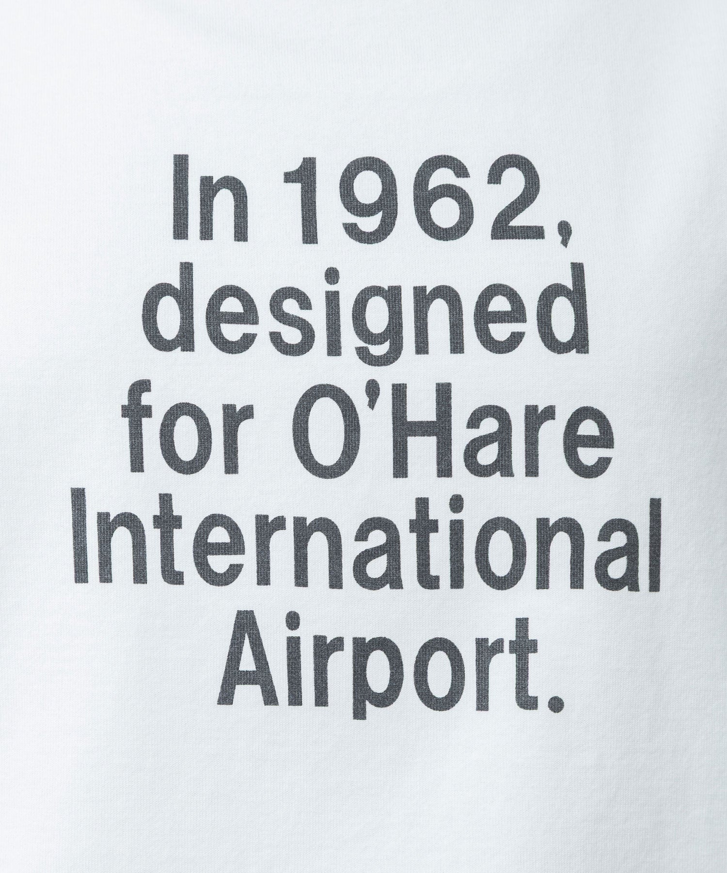 「1962年、オヘア国際空港のためのデザイン」という英文ロゴを、リズミカルな5行構成でレイアウトしたロゴプリントTシャツ。