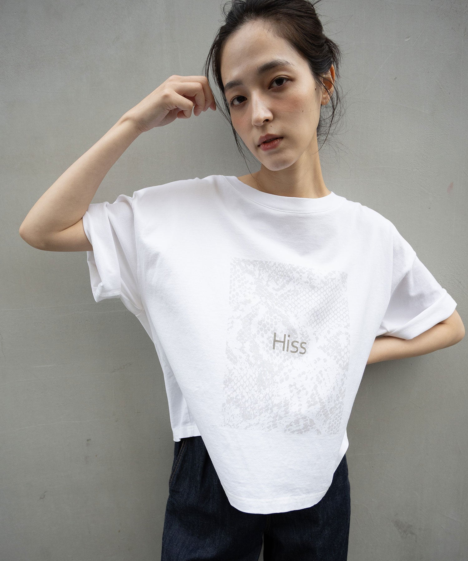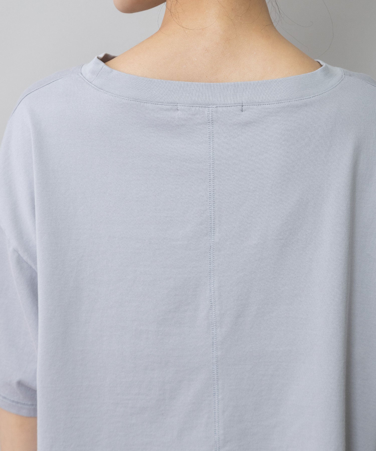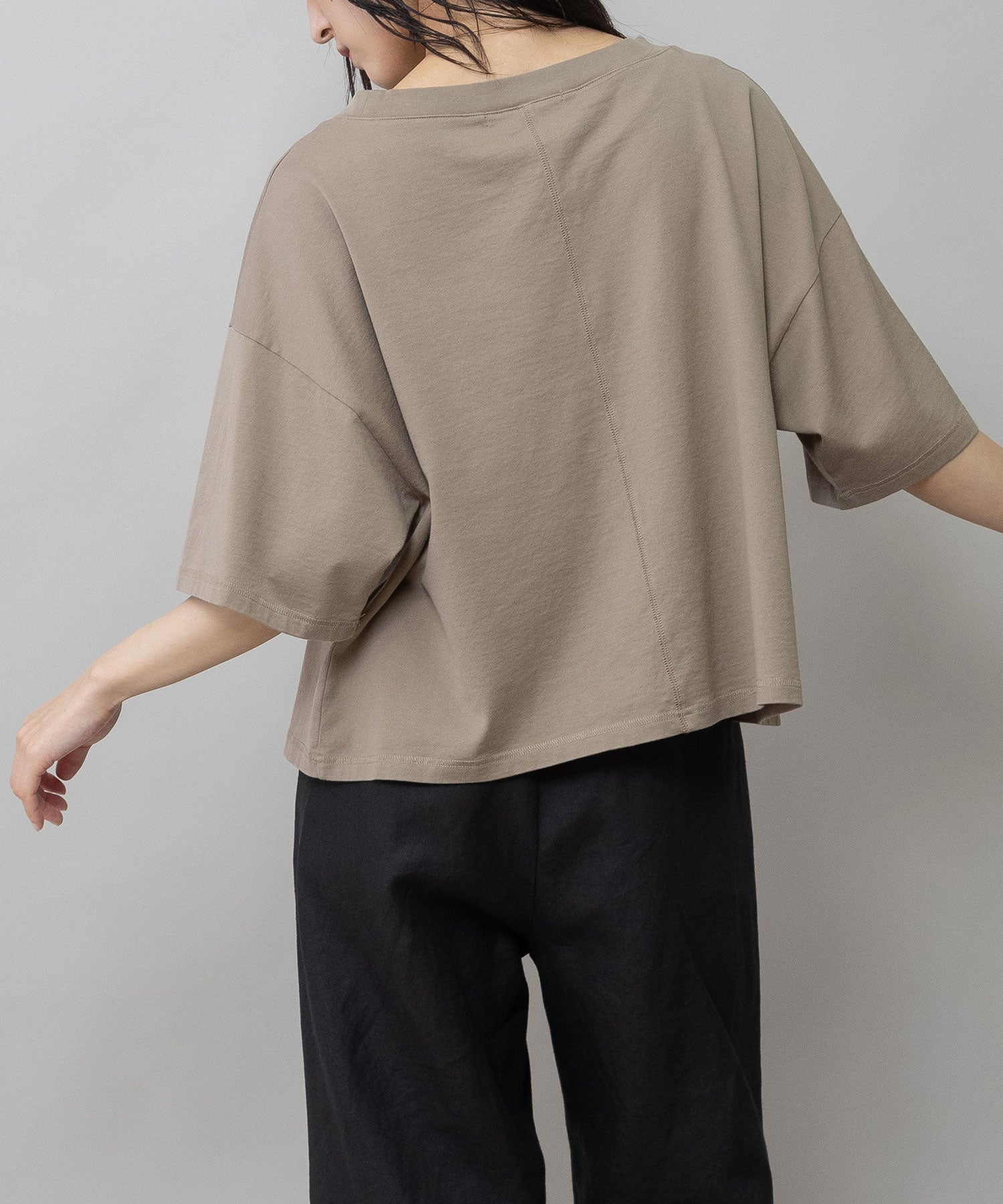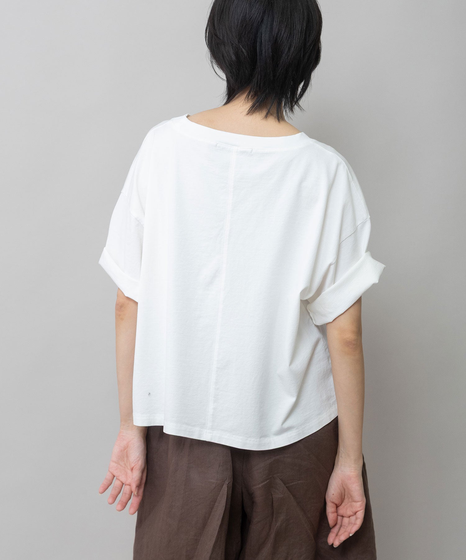 コンパクトな丈感とゆったりしたサイズ感が絶妙なバランスで、どんなボトムスとも合わせやすいTシャツです。