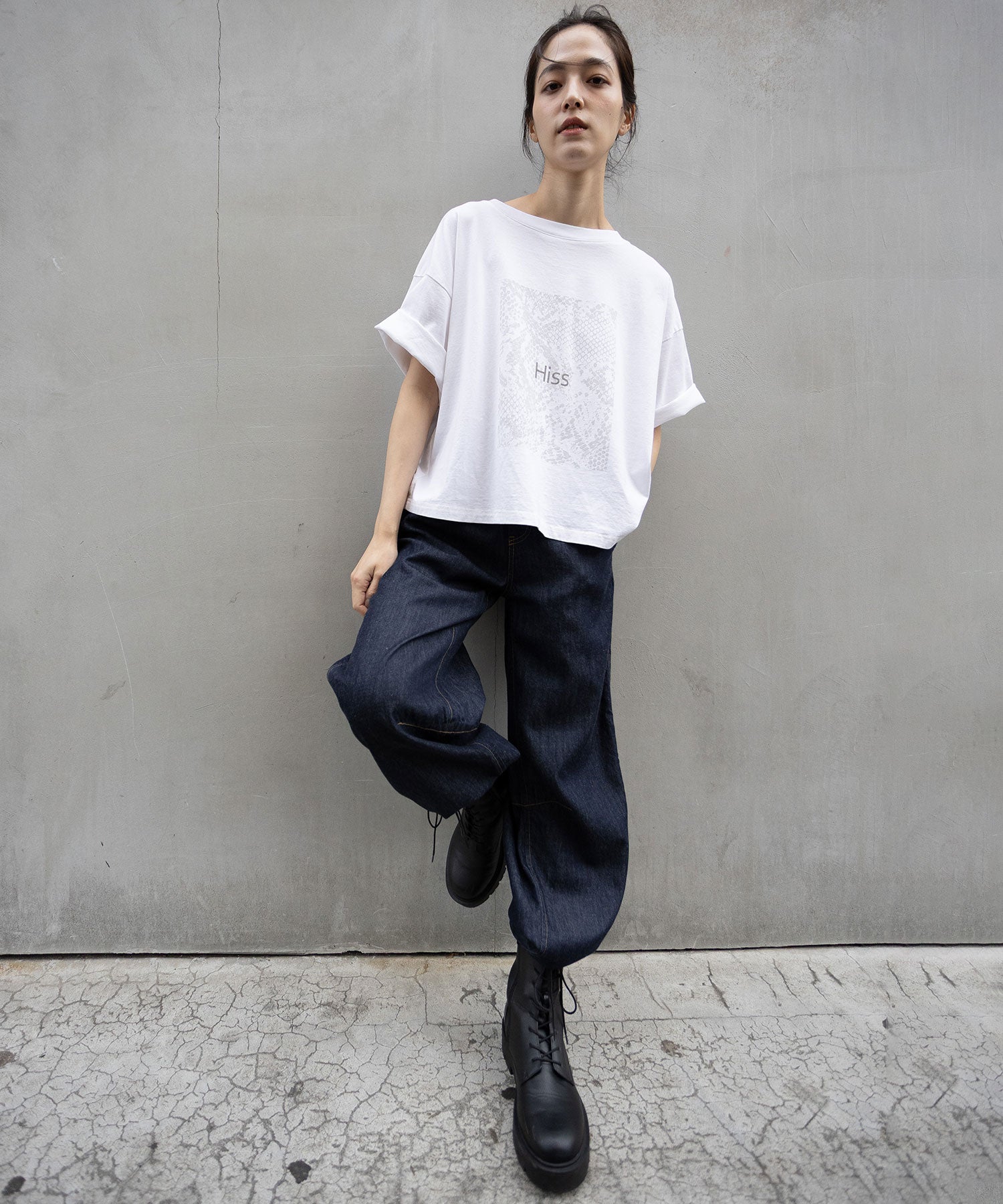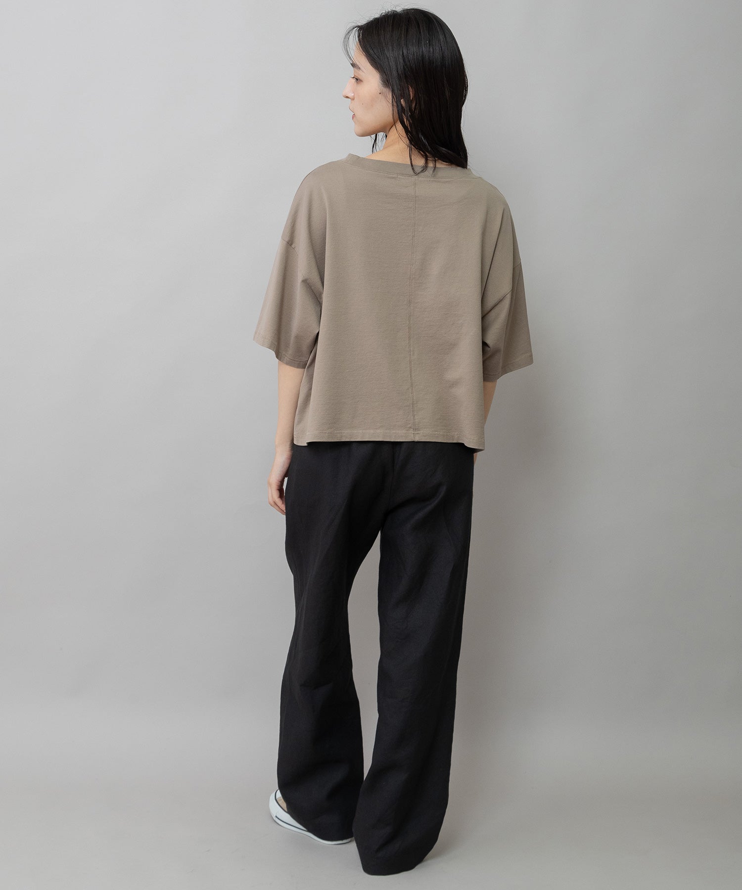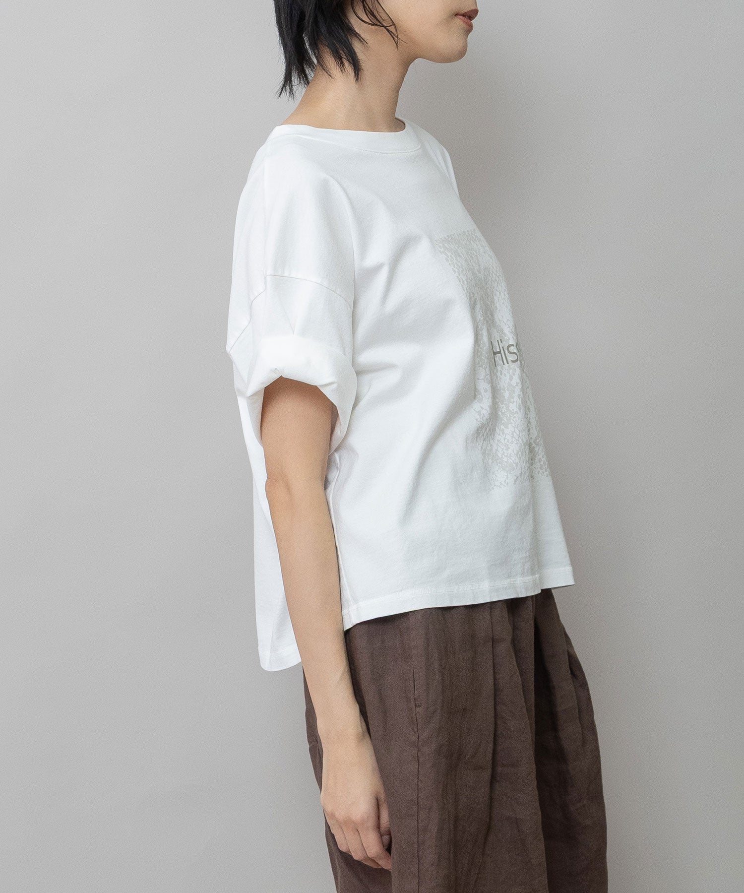 コンパクトな丈感とゆったりしたサイズ感が絶妙なバランスで、どんなボトムスとも合わせやすいTシャツです。