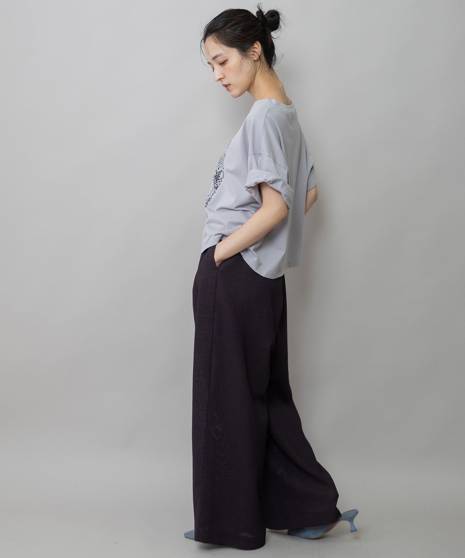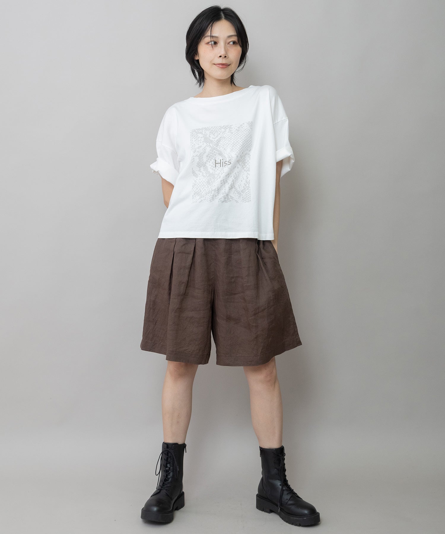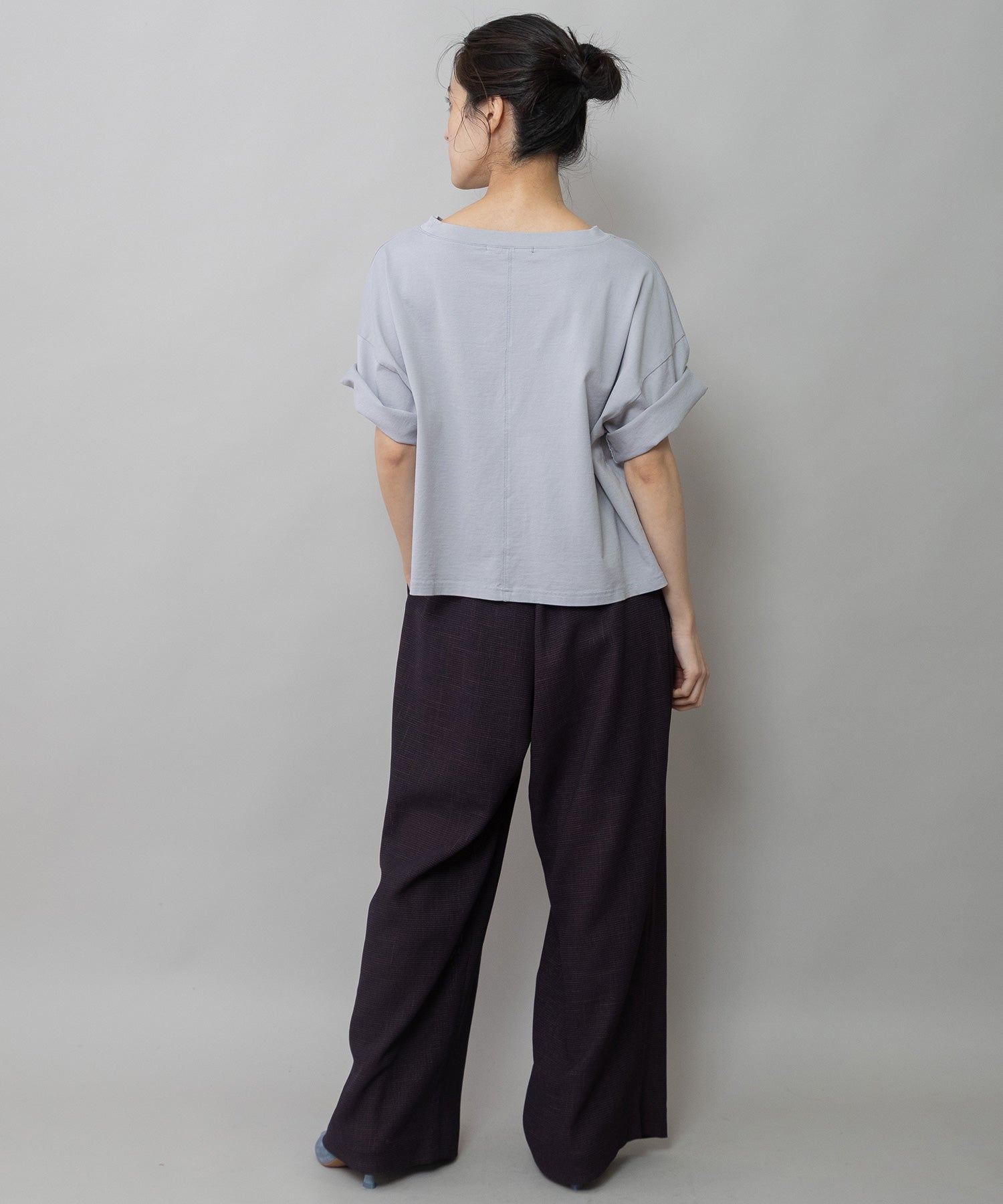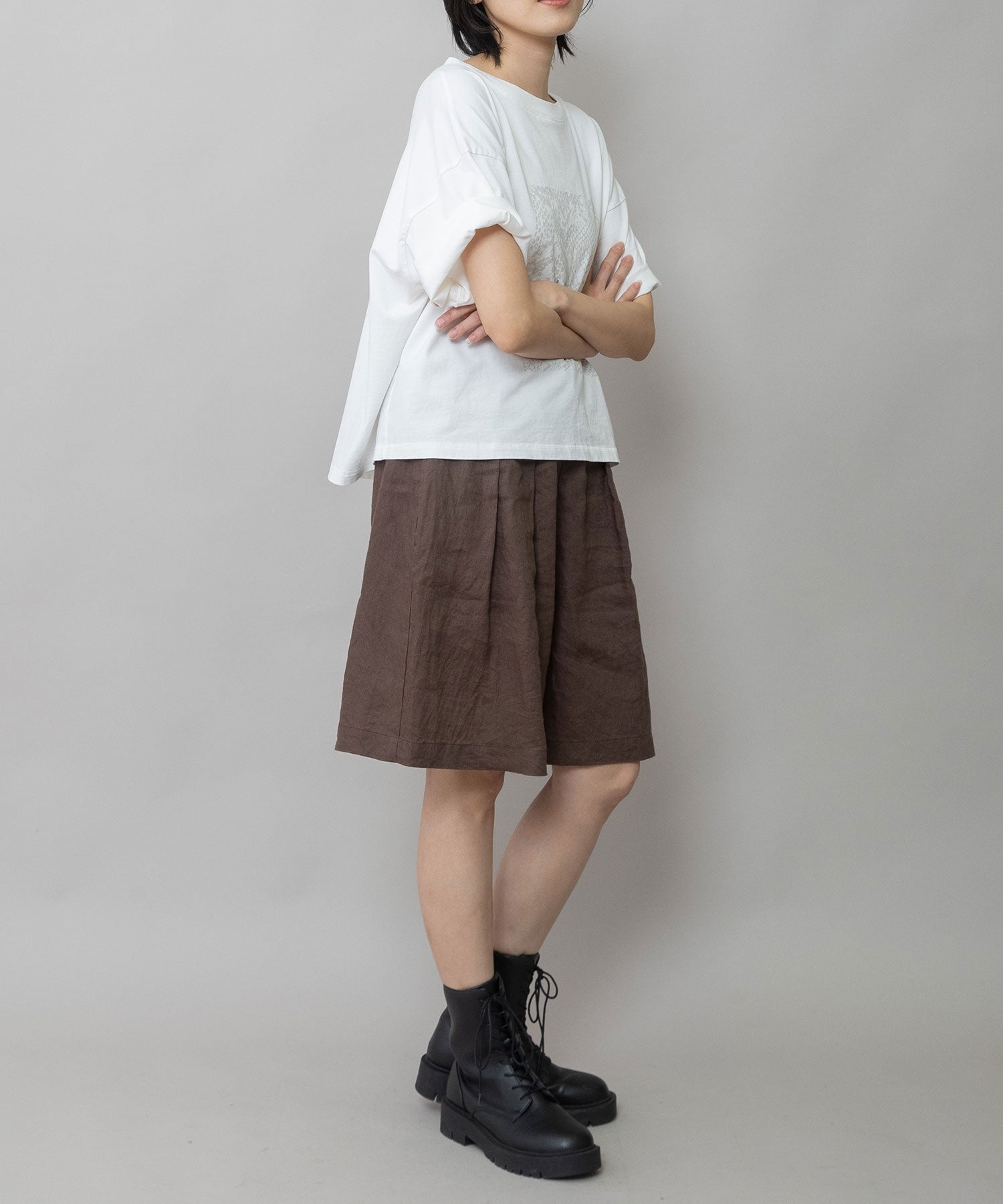 コンパクトな丈感とゆったりしたサイズ感が絶妙なバランスで、どんなボトムスとも合わせやすいTシャツです。