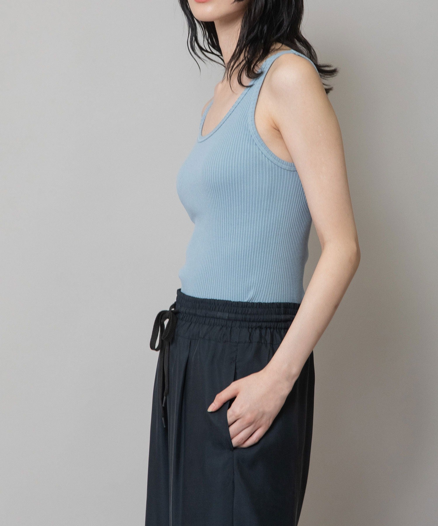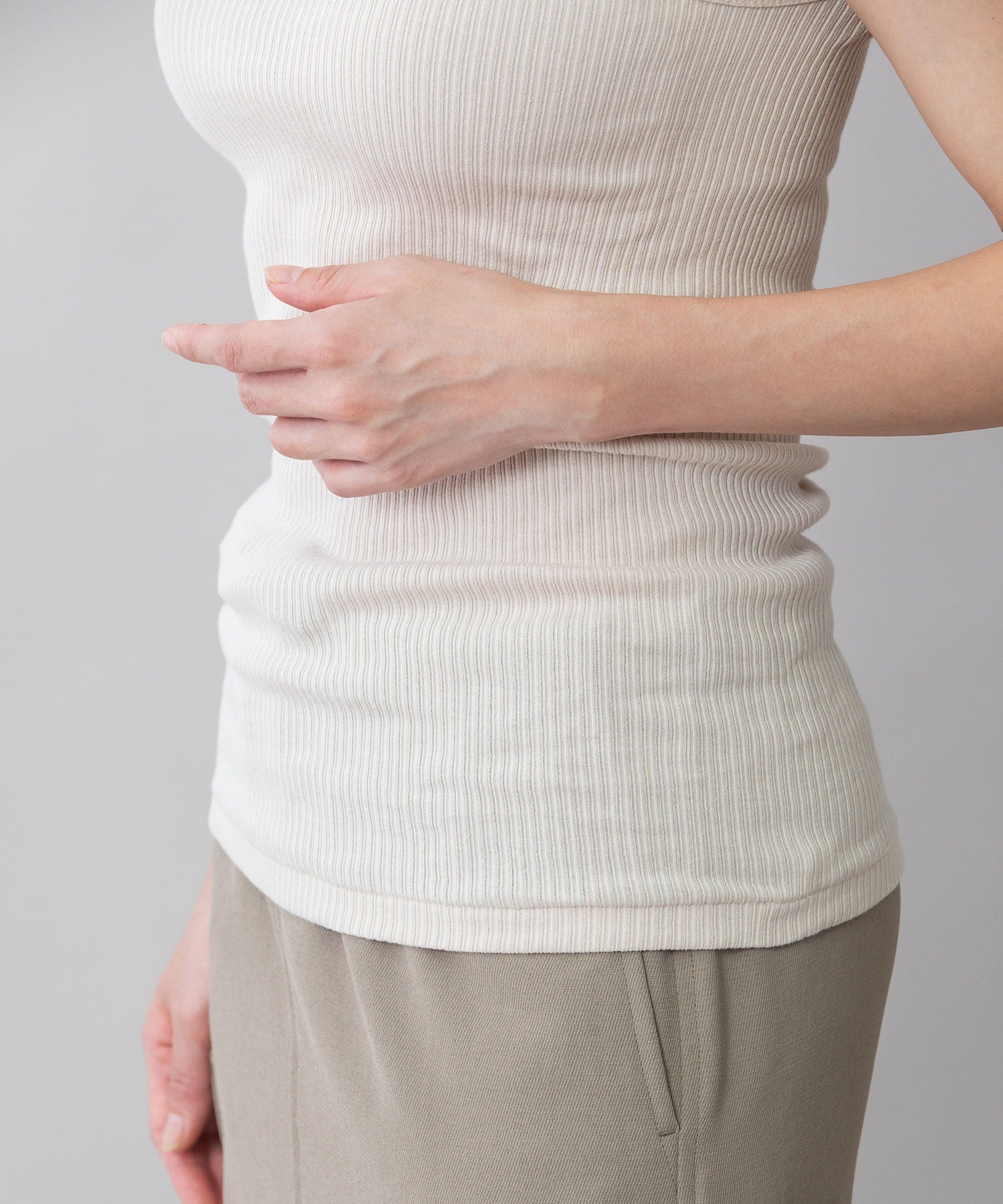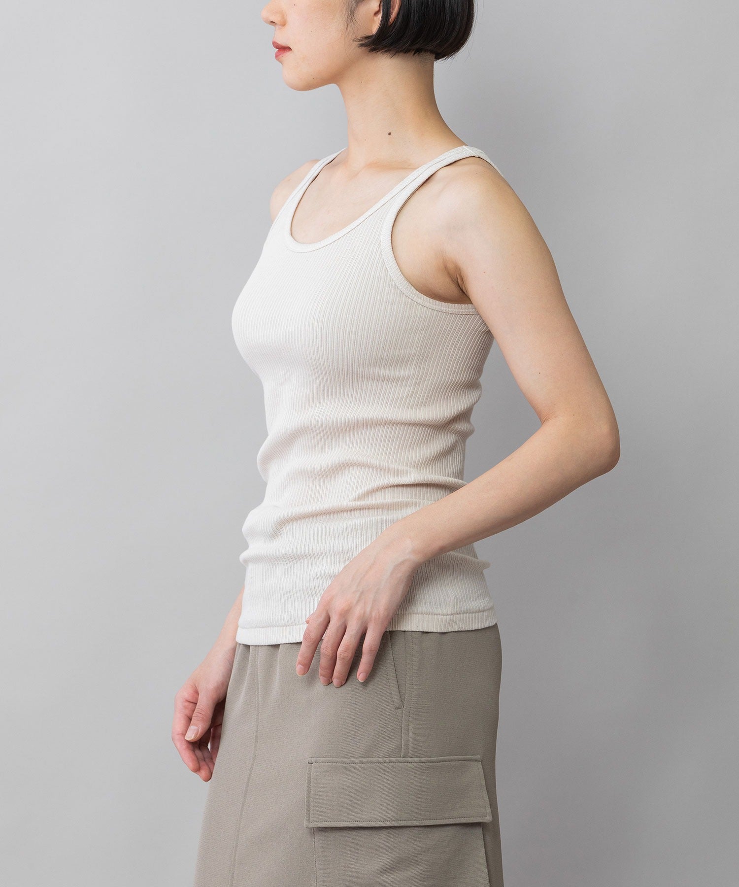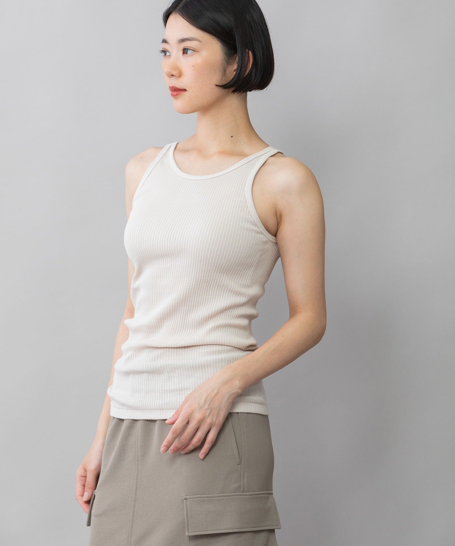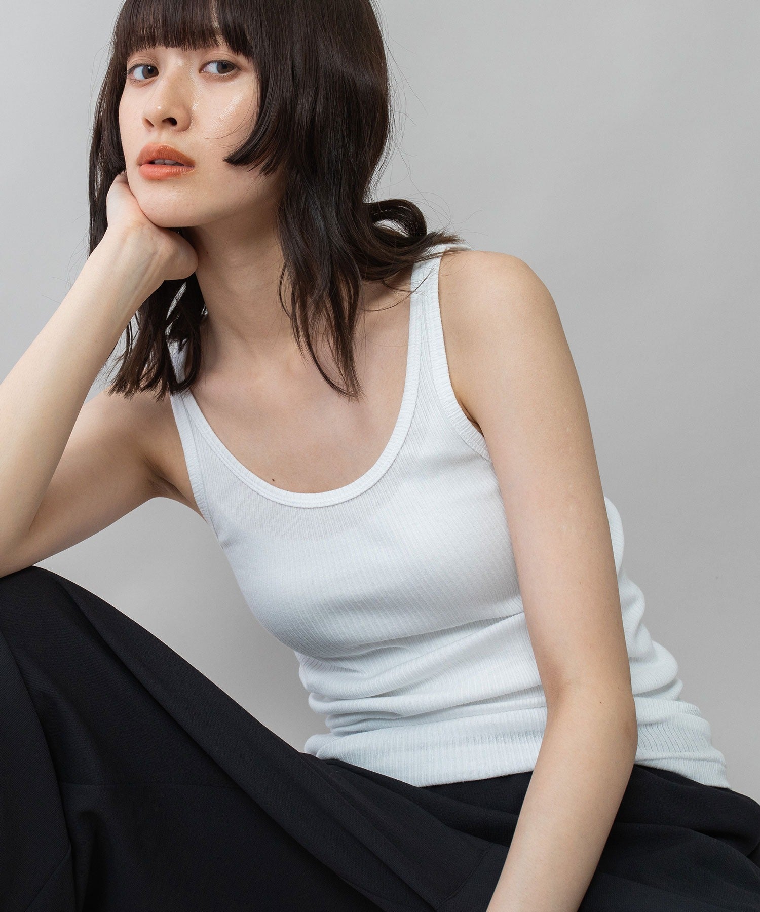合わせるアイテムで衿ぐりを変えられる便利な2wayタンクトップ。