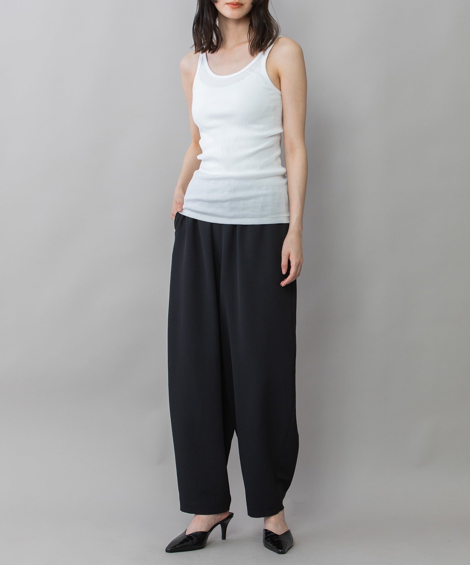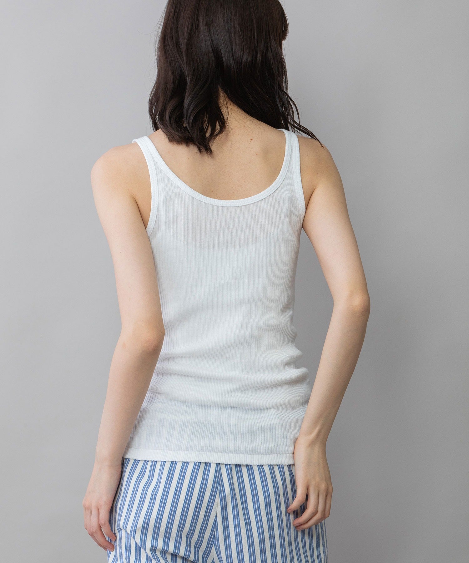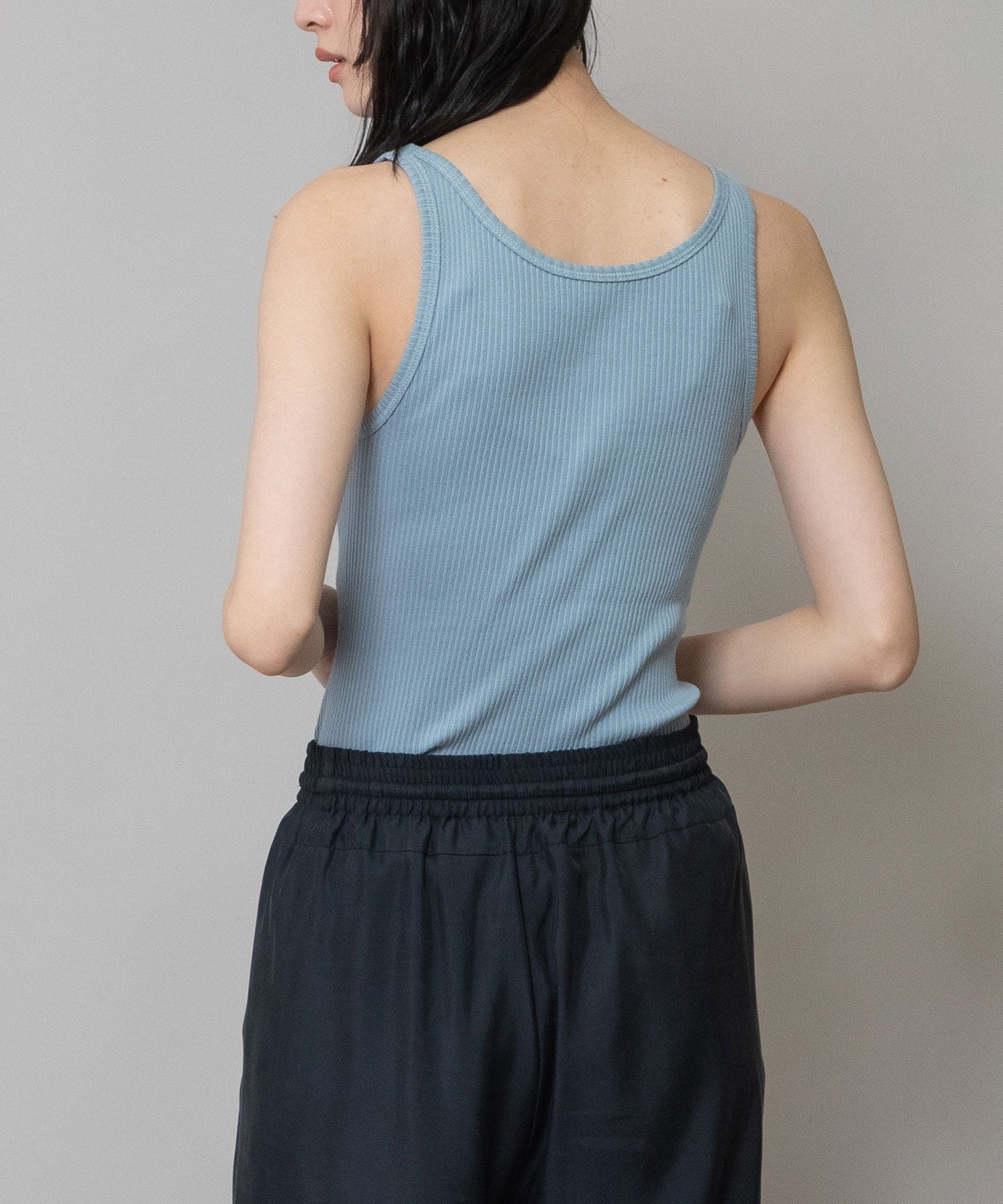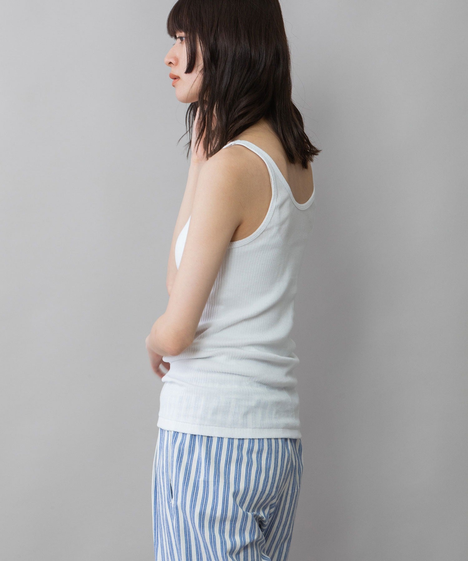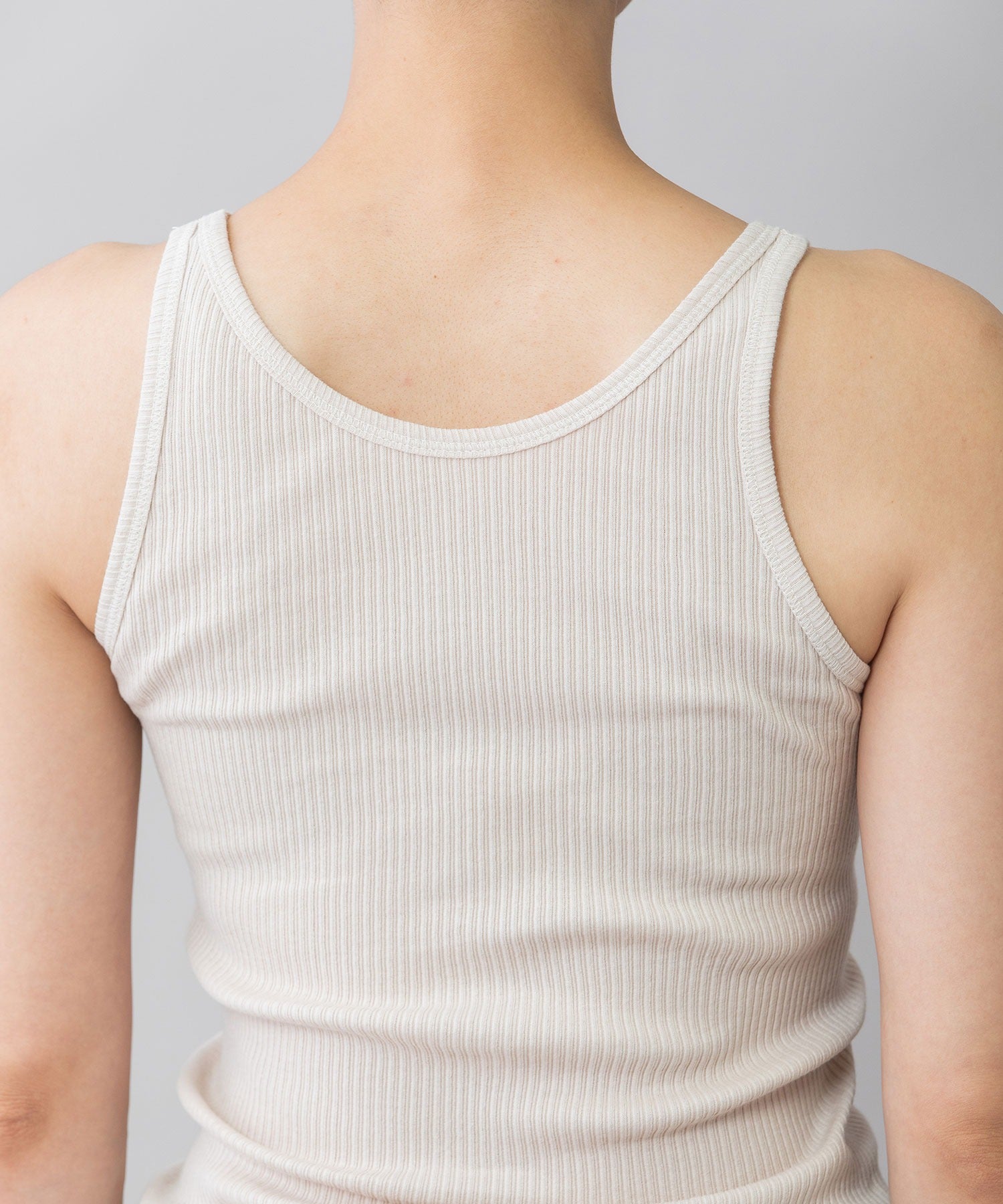 合わせるアイテムで衿ぐりを変えられる便利な2wayタンクトップ。