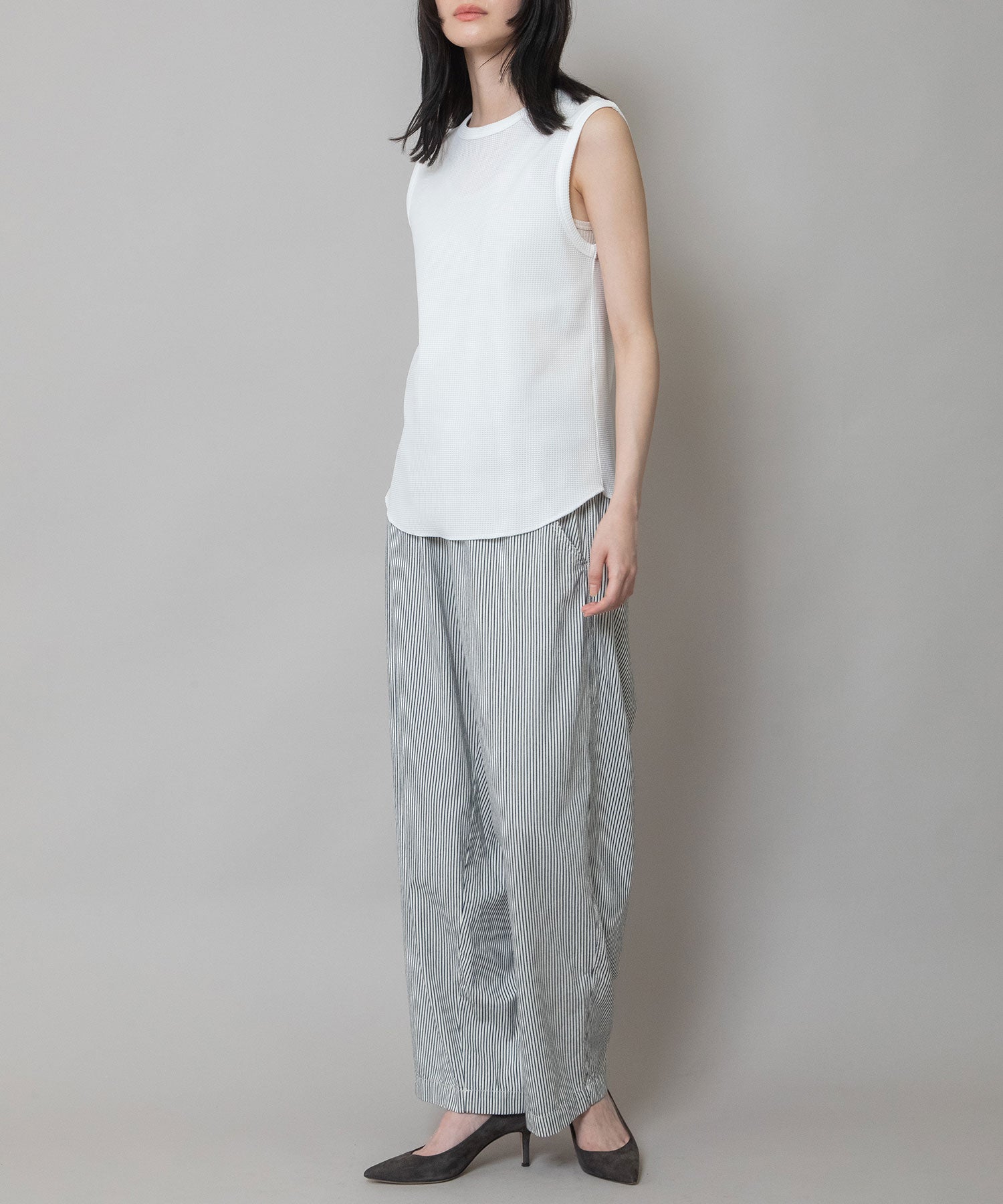 裾はほんのりラウンドさせて、オーバーロックで軽く仕上げ、ジャケットやカーディガン、サロペットのインナーとしても、もちろん一枚でも着やすいアイテムです。