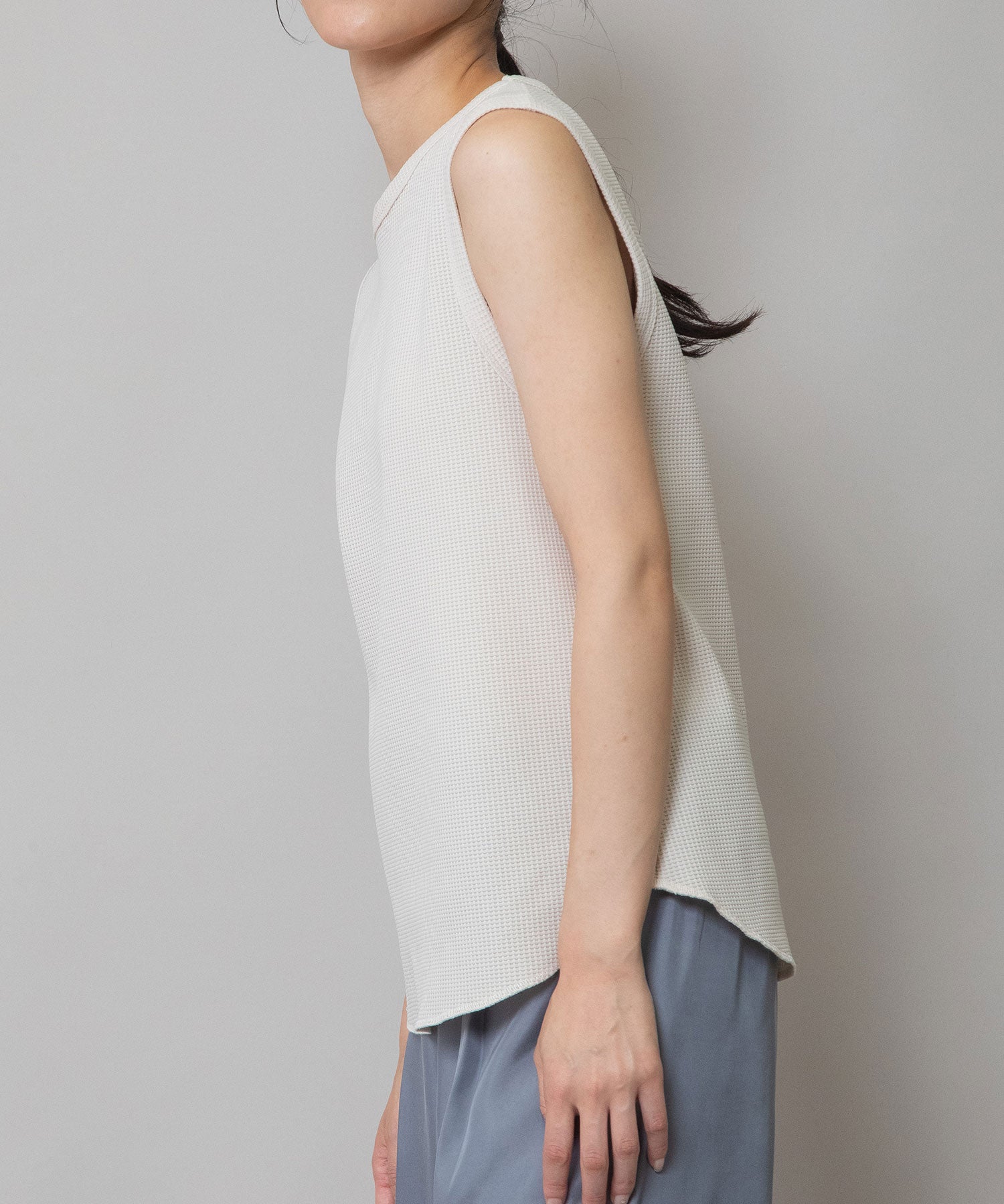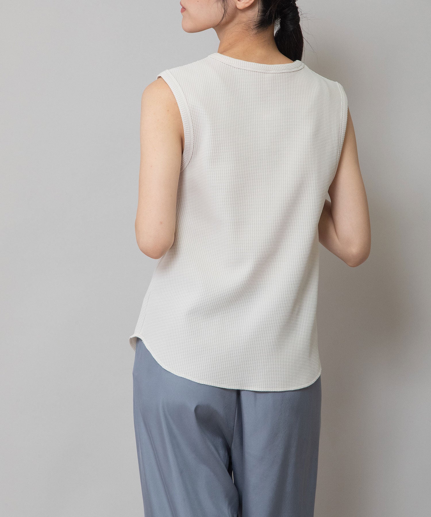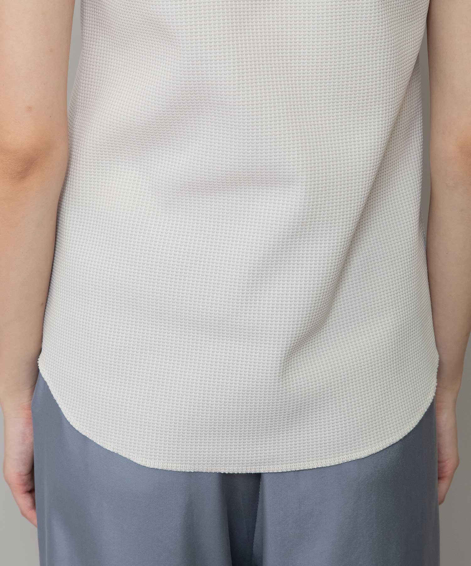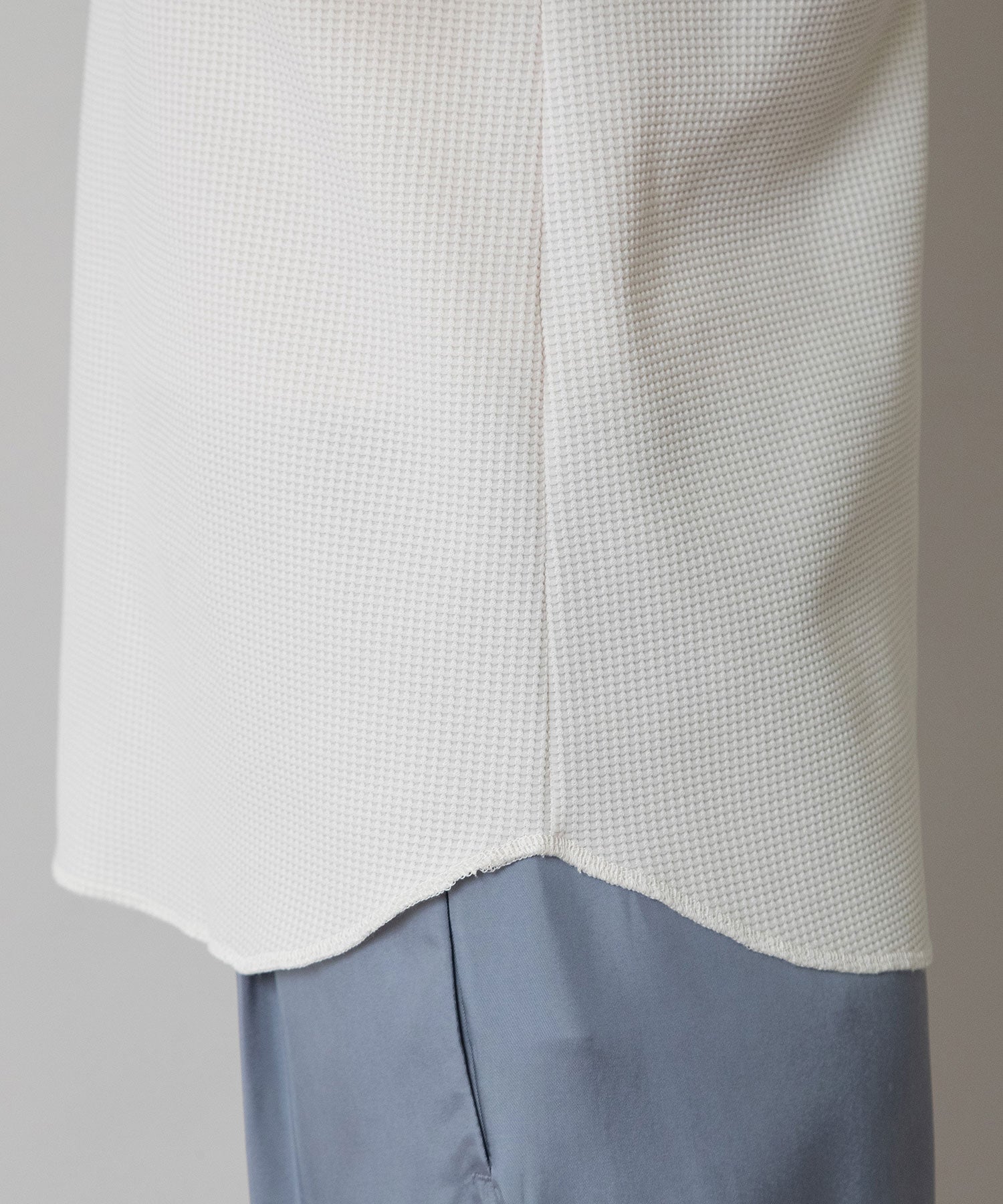 通常ワッフル素材は伸縮性に劣りますが、ポリエステルにすることで改善し、着心地の良さを叶えています。