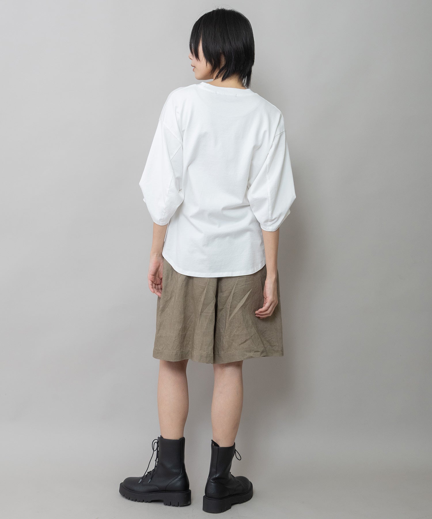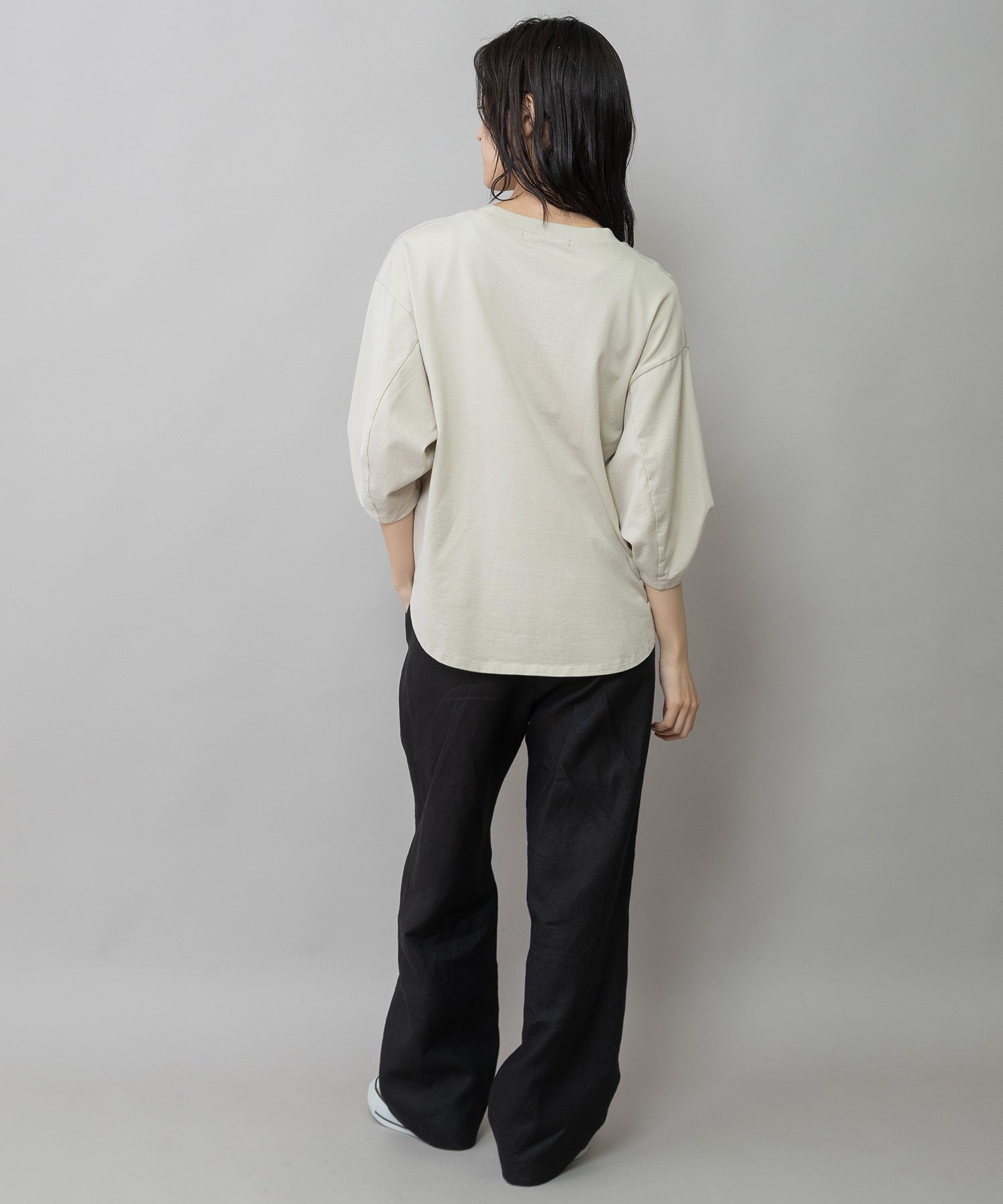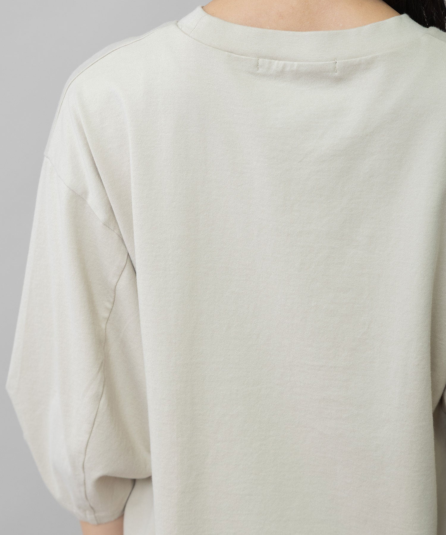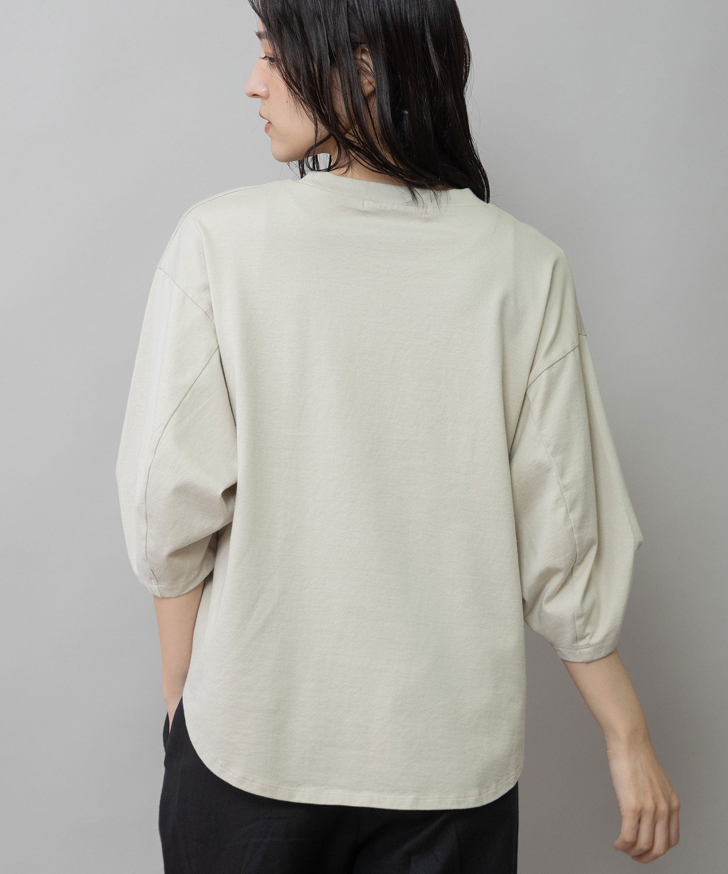 袖はタックと後ろの切替え線で丸みを入れて立体的なフォルムになり、シンプルながら袖がポイントになり、一枚で着て様になるアイテム。