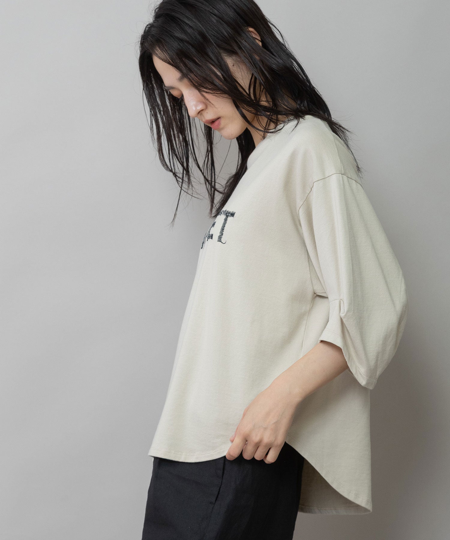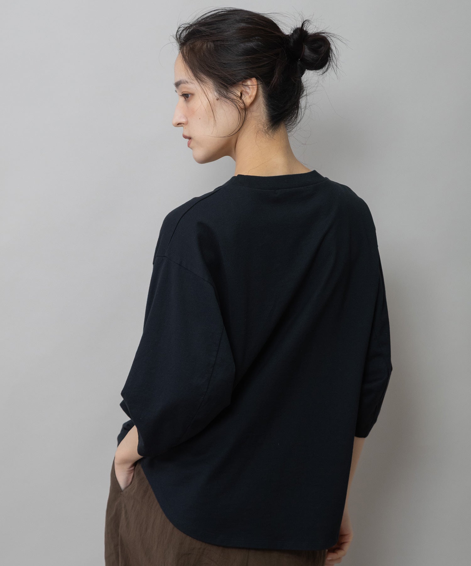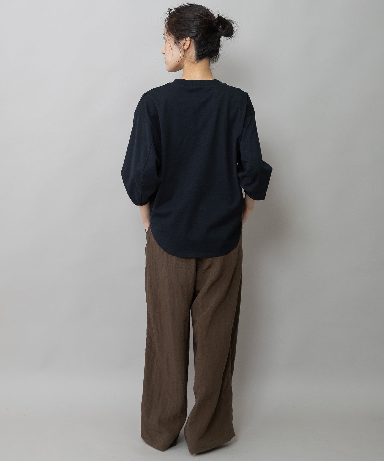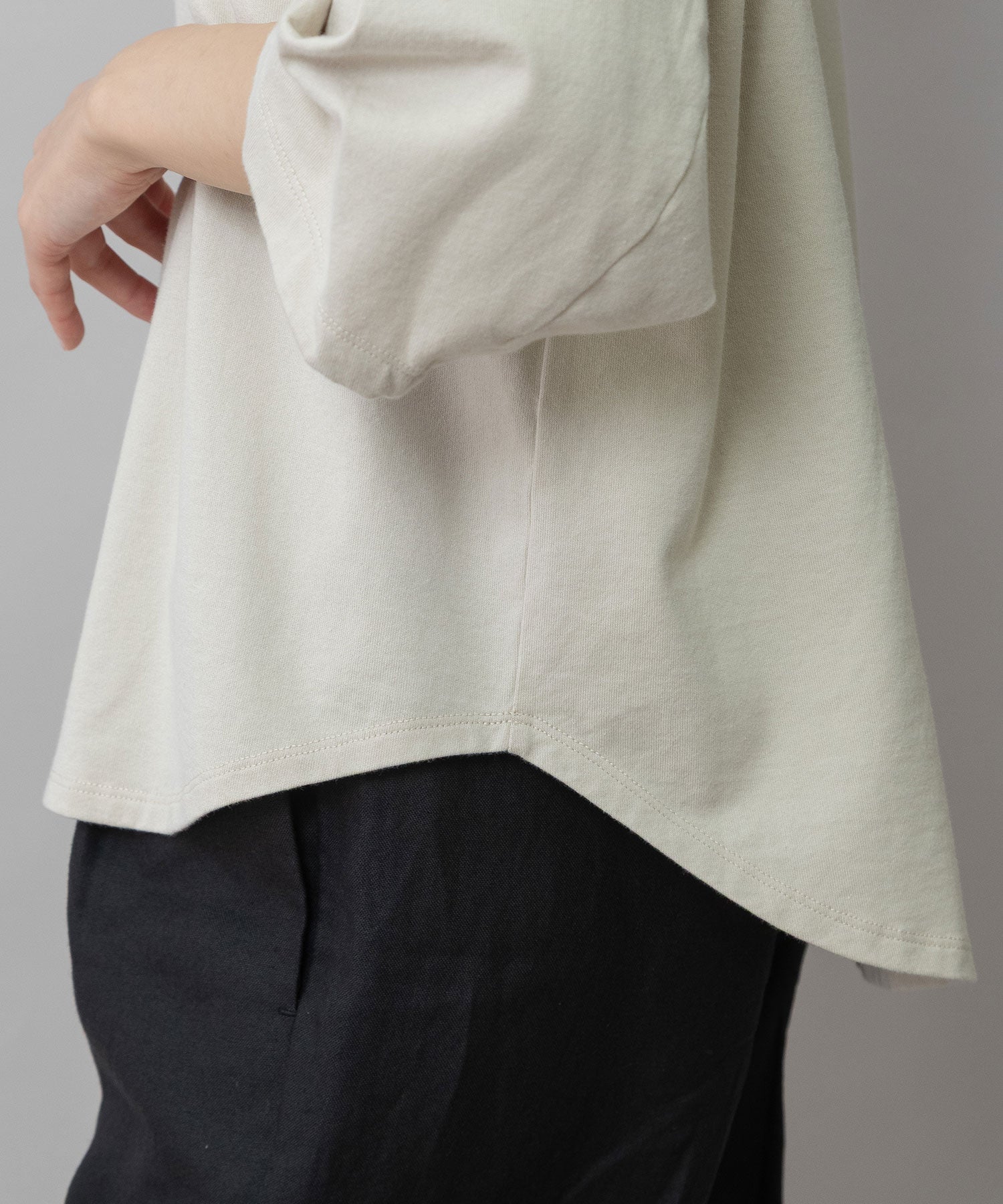 袖はタックと後ろの切替え線で丸みを入れて立体的なフォルムになり、シンプルながら袖がポイントになり、一枚で着て様になるアイテム。