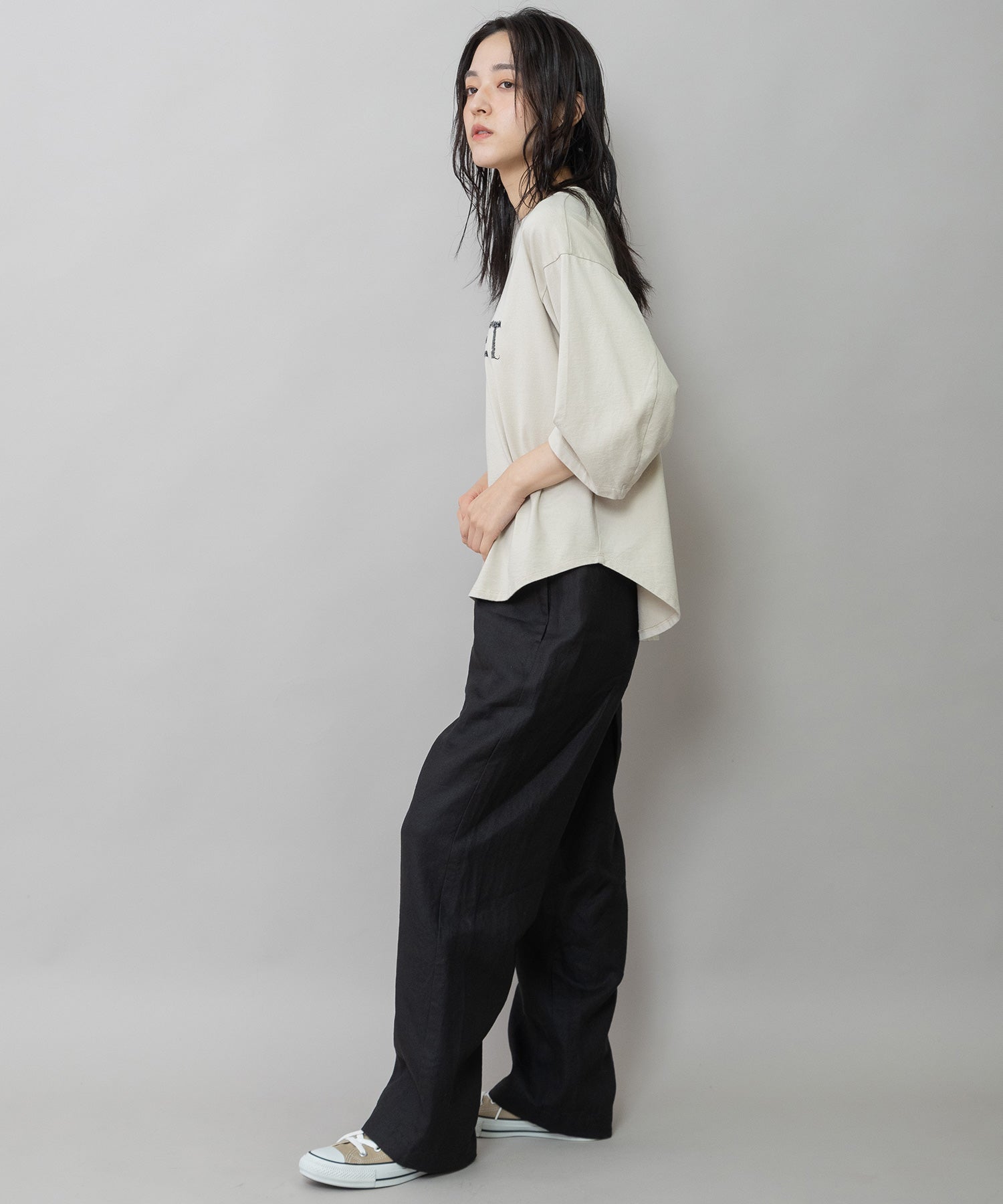 ほどよいゆとりと落ち感のあるシルエットで、シンプルながら抜け感のある雰囲気に。